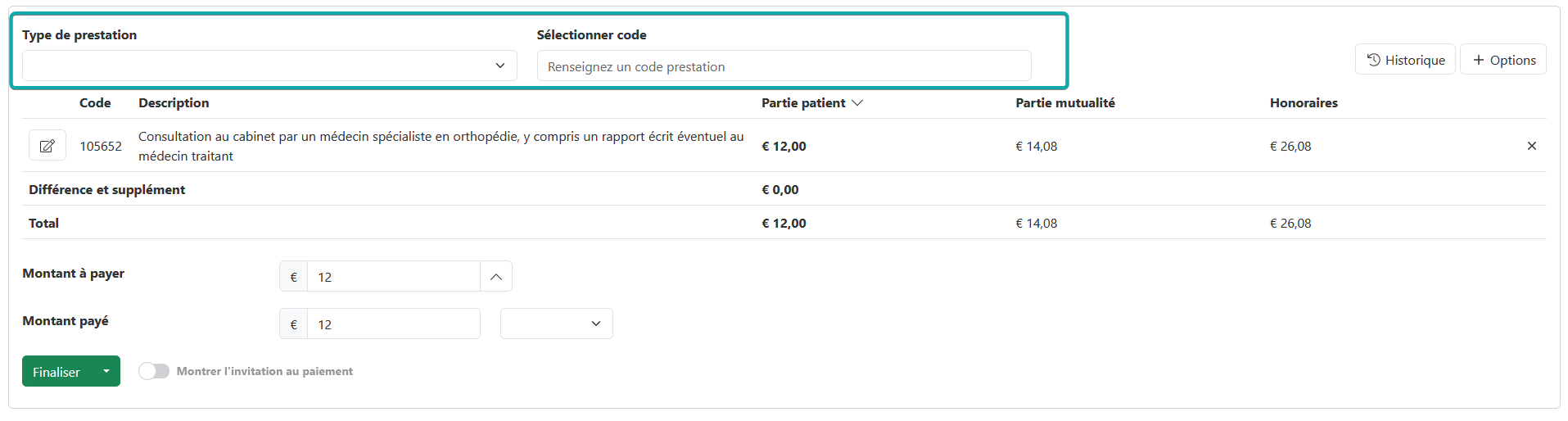 Vous pouvez ensuite introduire les codes souhaités. Cela peut se faire soit manuellement via le champ de recherche, soit en sélectionnant un types de prestation dans la liste. Pour en savoir plus sur les types de prestation, consultez cet article.