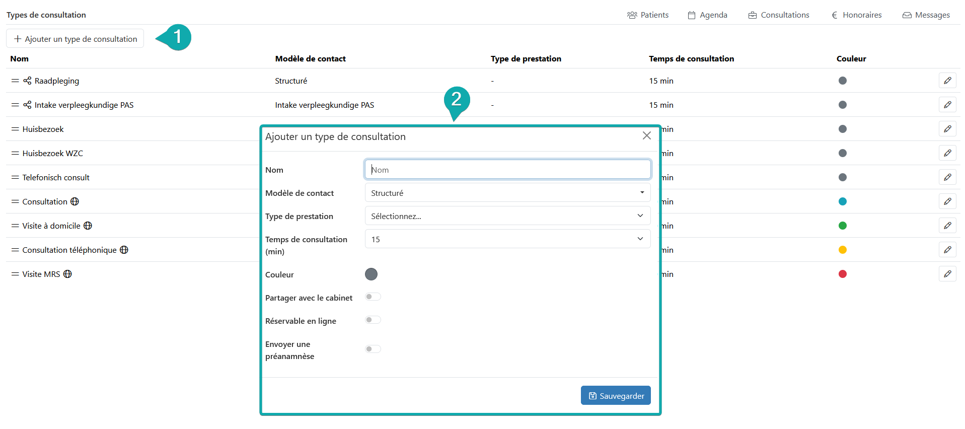 Accédez à vos paramètres, puis à la section « Types de consultation ». Cliquez sur le bouton « Ajouter un type de consultation » et remplissez les informations suivantes :