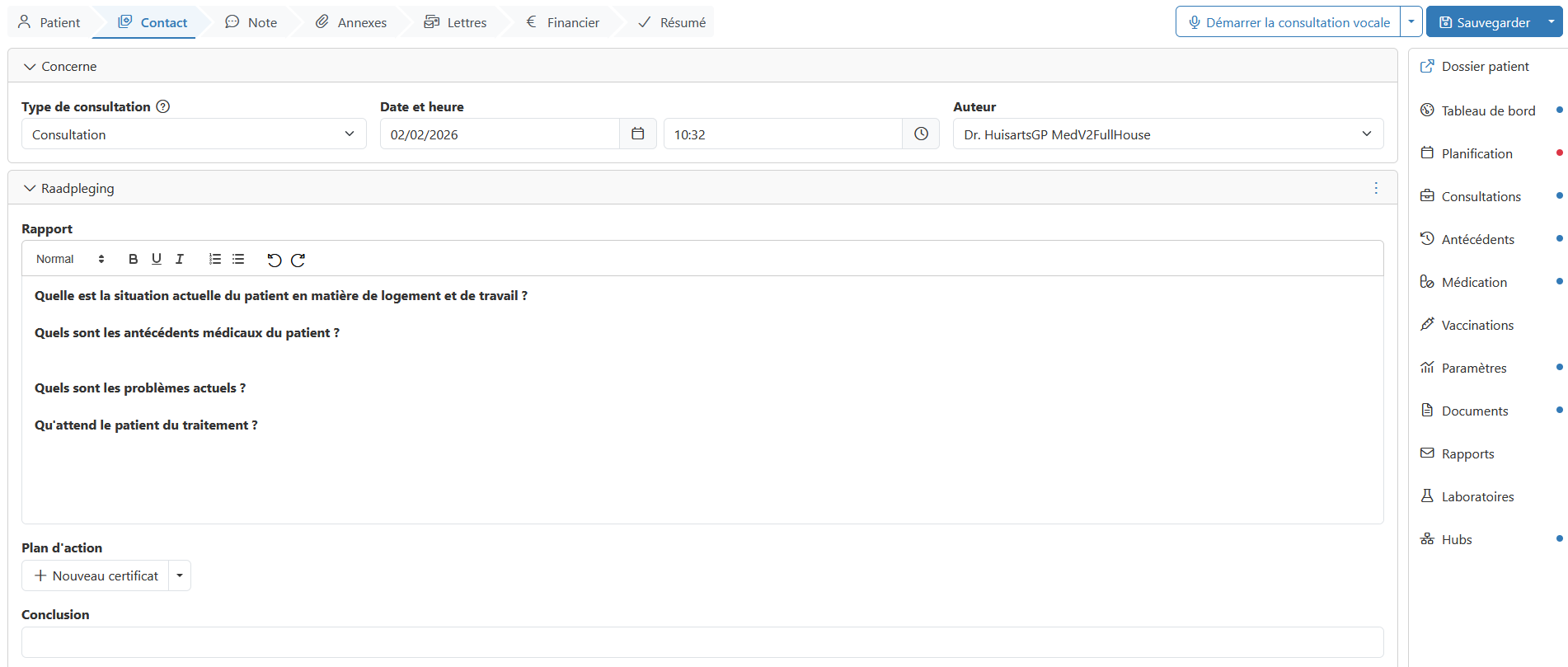 Sur le côté droit, vous verrez les données relatives au patient et à la consultation. Si vous ajoutez ces champs à votre modèle, ils seront remplacés par les données de ce patient/consultation spécifique lors d'une consultation.