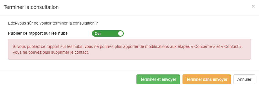 Dans le cadre de ce développement, un nouveau statut a été ajouté à l'aperçu des consultations. Désormais, il est aussi immédiatement visible si le rapport a déjà été publié sur les hubs. Chaque statut est représenté par un code couleur spécifique.