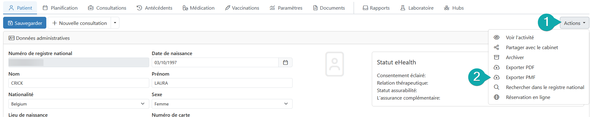 Via Mediris, vous pouvez facilement transmettre le dossier patient à un autre prestataire de soins. Dans le dossier patient, vous choisissez de l'exporter au format PMF via le bouton « Actions ».