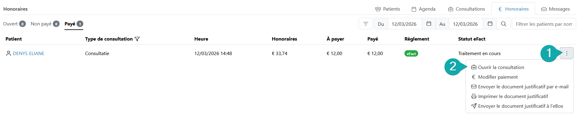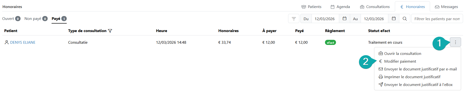 Dans l'onglet « Honoraires », certains éléments de base peuvent encore être modifiés, à savoir le montant à payer, le montant payé, le mode de paiement et le commentaire. Vous pouvez modifier le paiement en cliquant sur les trois points.