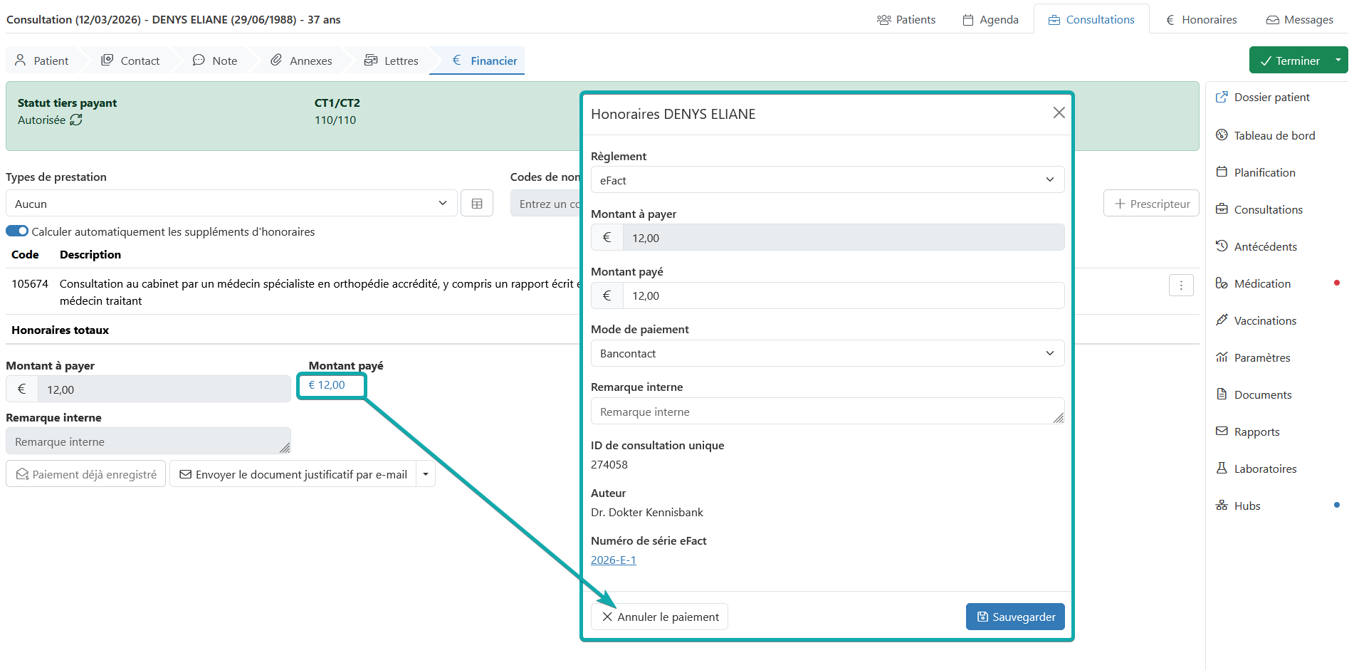 Si vous souhaitez modifier d'autres éléments du paiement, comme le code de nomenclature, choisissez d'ouvrir la consultation via les trois points. Cliquez ensuite sur le montant payé et confirmez que vous souhaitez annuler le paiement.