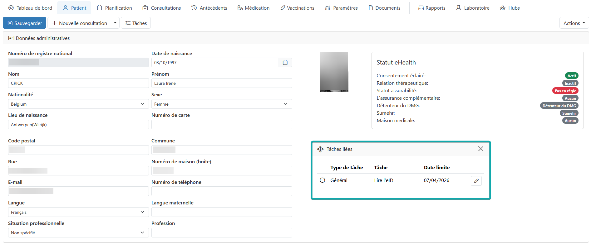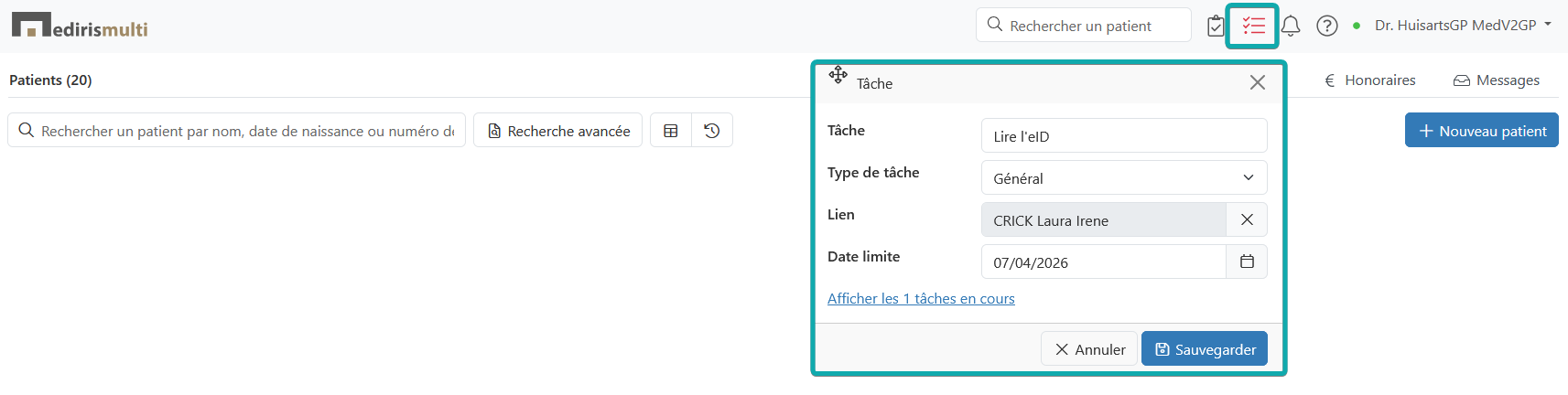 Lorsqu'une tâche est liée à un dossier patient, elle s'affiche sous forme de fenêtre pop-up à l'ouverture de ce dossier.