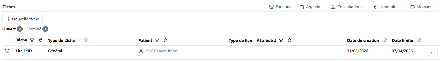 Vous pouvez consulter la liste complète des tâches en attente en cliquant sur le lien dans la fenêtre pop-up. Vous pouvez également y valider rapidement des tâches ou les filtrer, par exemple en fonction du prestataire de soins auquel elles ont été attribuées.