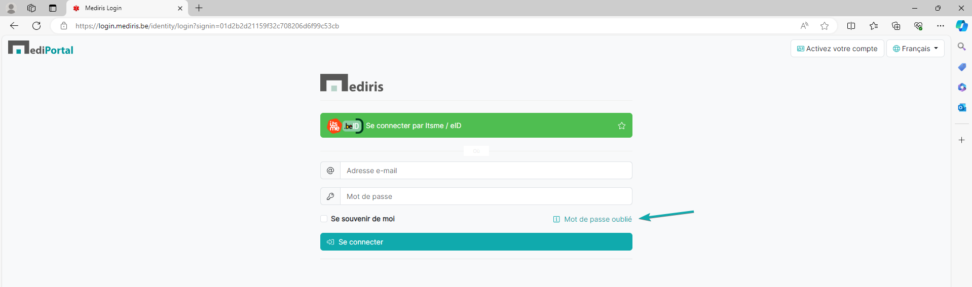 Pour vous connecter avec votre adresse e-mail, vous devez d'abord activer votre compte. Vous pouvez le faire via https://login.mediris.be/. Cliquez sur « Activez votre compte » en haut à droite et introduisez votre adresse e-mail. Vous recevrez un e-mail vous permettant de choisir un mot de passe.