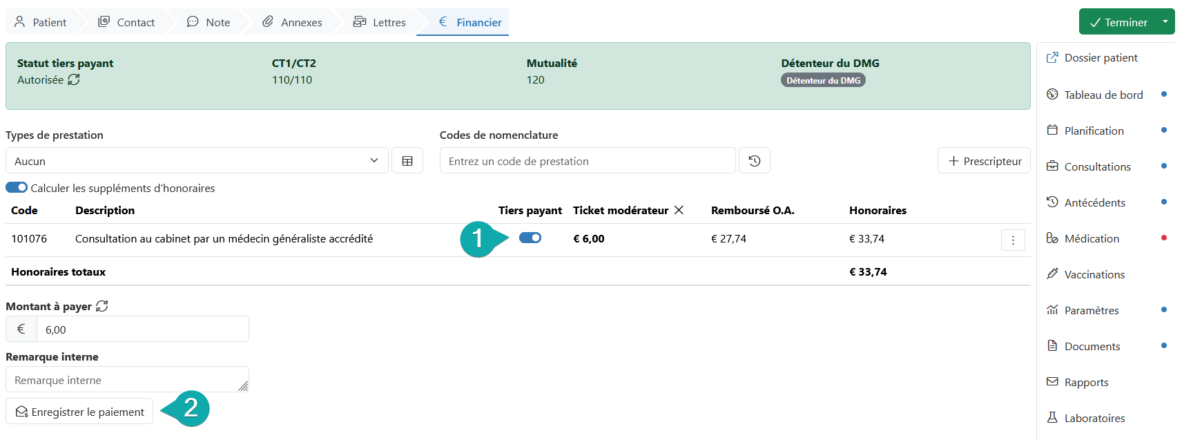 Comment ? Assurez-vous que le bascule « Tiers payant » est activé à côté du code de nomenclature.