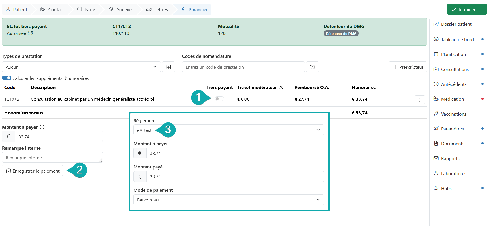 Comment ? Le bascule « Tiers payant » doit être desactivé et, dans la fenêtre pop-up, il faut sélectionner le règlement via eAttest. Lors de l'enregistrement, l'eAttest est immédiatement envoyé à la mutualité. Le patient reçoit le remboursement environ deux jours plus tard.