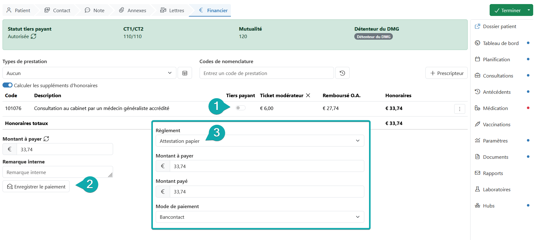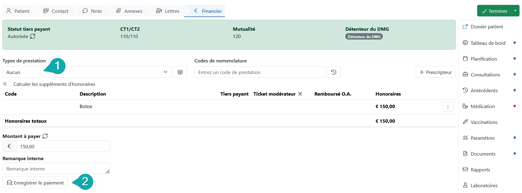 À l'étape « Financier » d'une , vous pouvez enregistrer le paiement. Cela se fait à l'aide d'un code de nomenclature ou d'un type de prestation.
