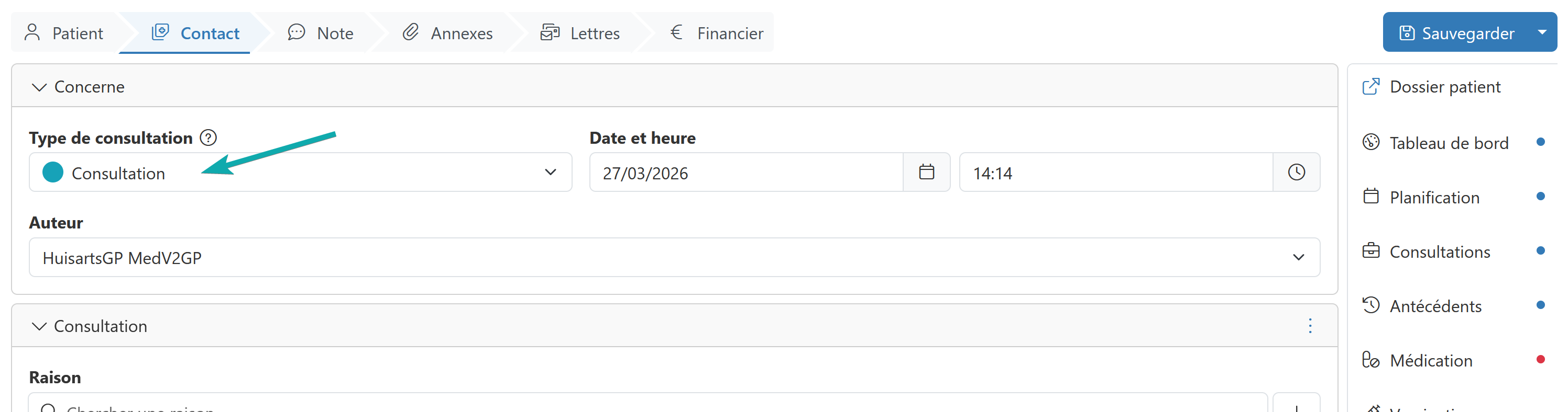 À l'étape « Contact », vous choisissez le type de consultation souhaité, ce qui sera également le titre de votre lettre. Vous pouvez créer vos propres types de consultation dans les paramètres. En tant que médecin généraliste, vous trouverez ici quatre types par défaut (consultation, visite à domicile, visite à domicile MRS et consultation téléphonique).