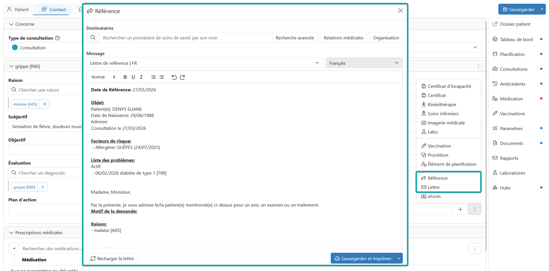 Lors d'une consultation, vous pouvez facilement envoyer des lettres à d'autres prestataires de soins. Un certificat eHealth n'est pas obligatoire pour cela, mais si vous disposez d'un numéro INAMI, nous vous recommandons de le télécharger. L'envoi des lettres sera alors plus rapide.