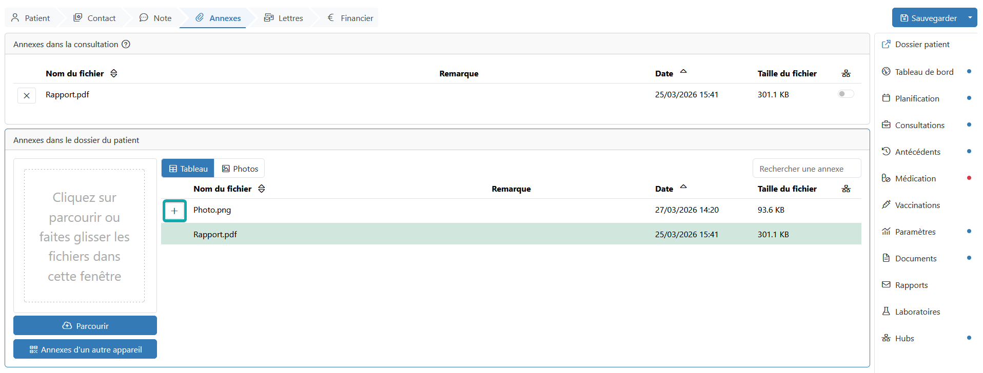 Si nécessaire, vous pouvez ajouter des documents à la lettre à l'étape « Annexes ». Il peut s'agir, par exemple, d'une photo ou d'un scan. Ajoutez l'annexe à la consultation en cliquant sur l'icône « + ».