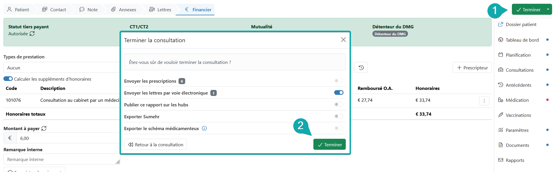 Une fois que vous avez tout saisi correctement, vous pouvez terminer la consultation. Pour ce faire, cliquez sur le bouton vert à l'étape « Financier » ou, à n'importe quelle étape, sur la flèche située à côté de « Sauvegarder ». Dans la fenêtre pop-up, confirmez enfin que la lettre peut être envoyée.