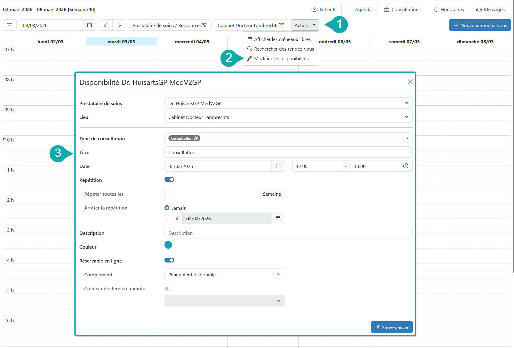 - Types de consultation : Indiquez les raisons pour lesquelles vous êtes disponible à ce moment-là. Avez-vous indiqué que ces types sont réservables en ligne ? Dans ce cas, ils seront visibles pour le patient.