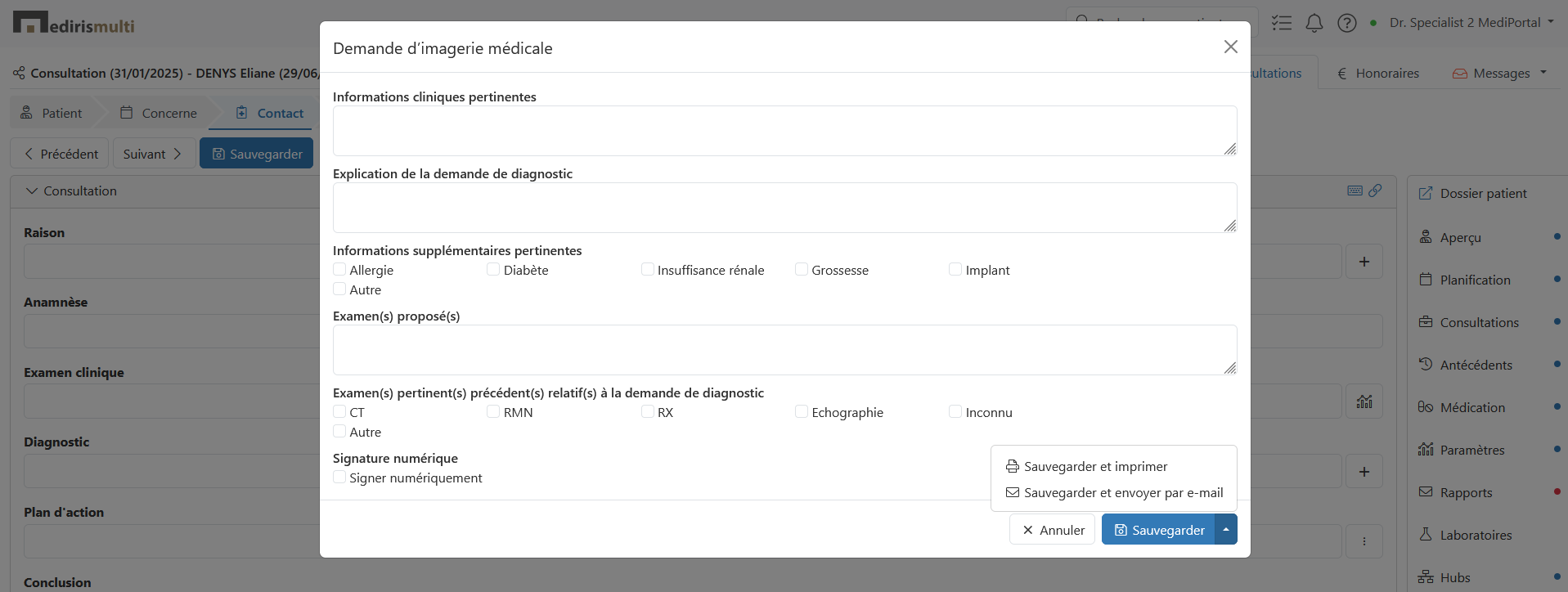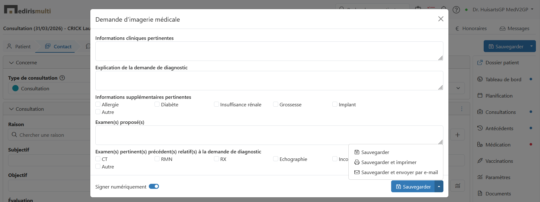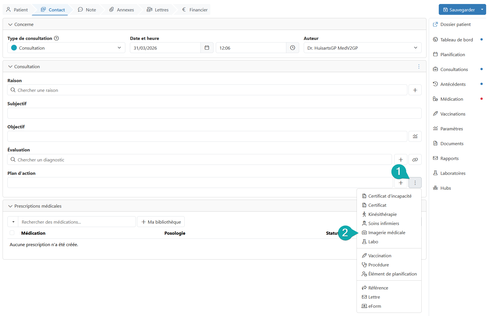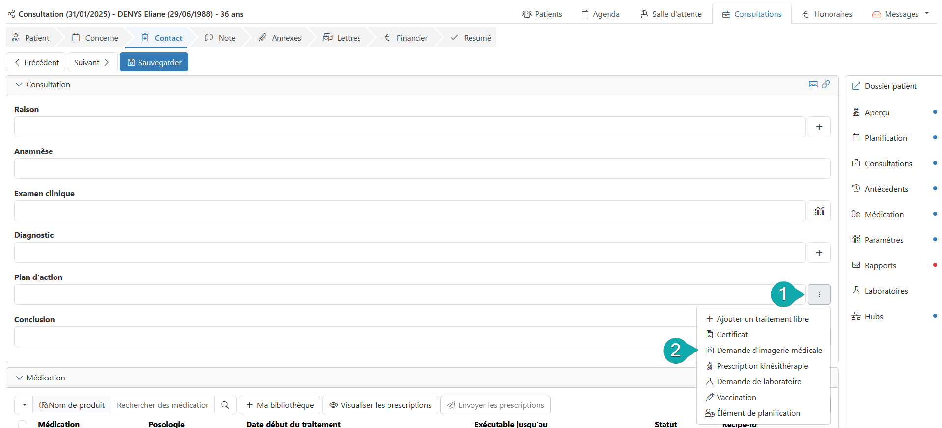 Lors d'une consultation, vous pouvez créer une nouvelle demande d'imagerie médicale dans l'étape « Contact » dans le plan d'action.
