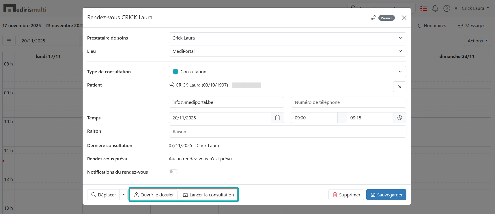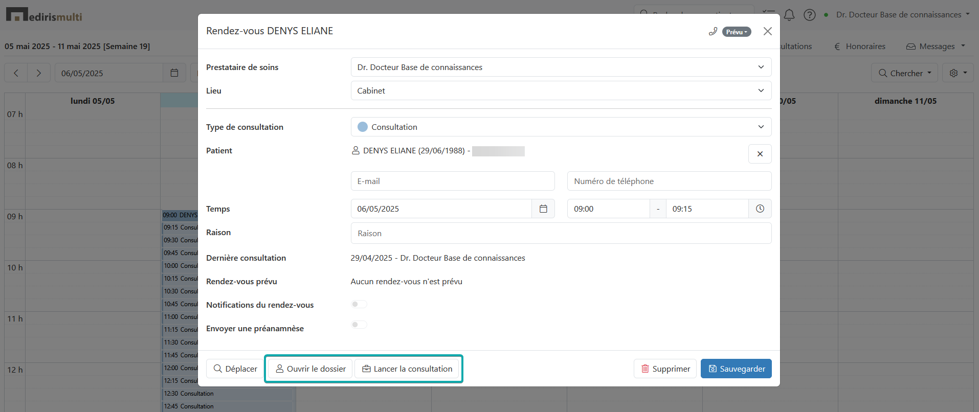 Au moment où le patient vient en consultation, vous pouvez cliquer sur le rendez-vous et ainsi ouvrir le dossier ou commencer la consultation immédiatement.