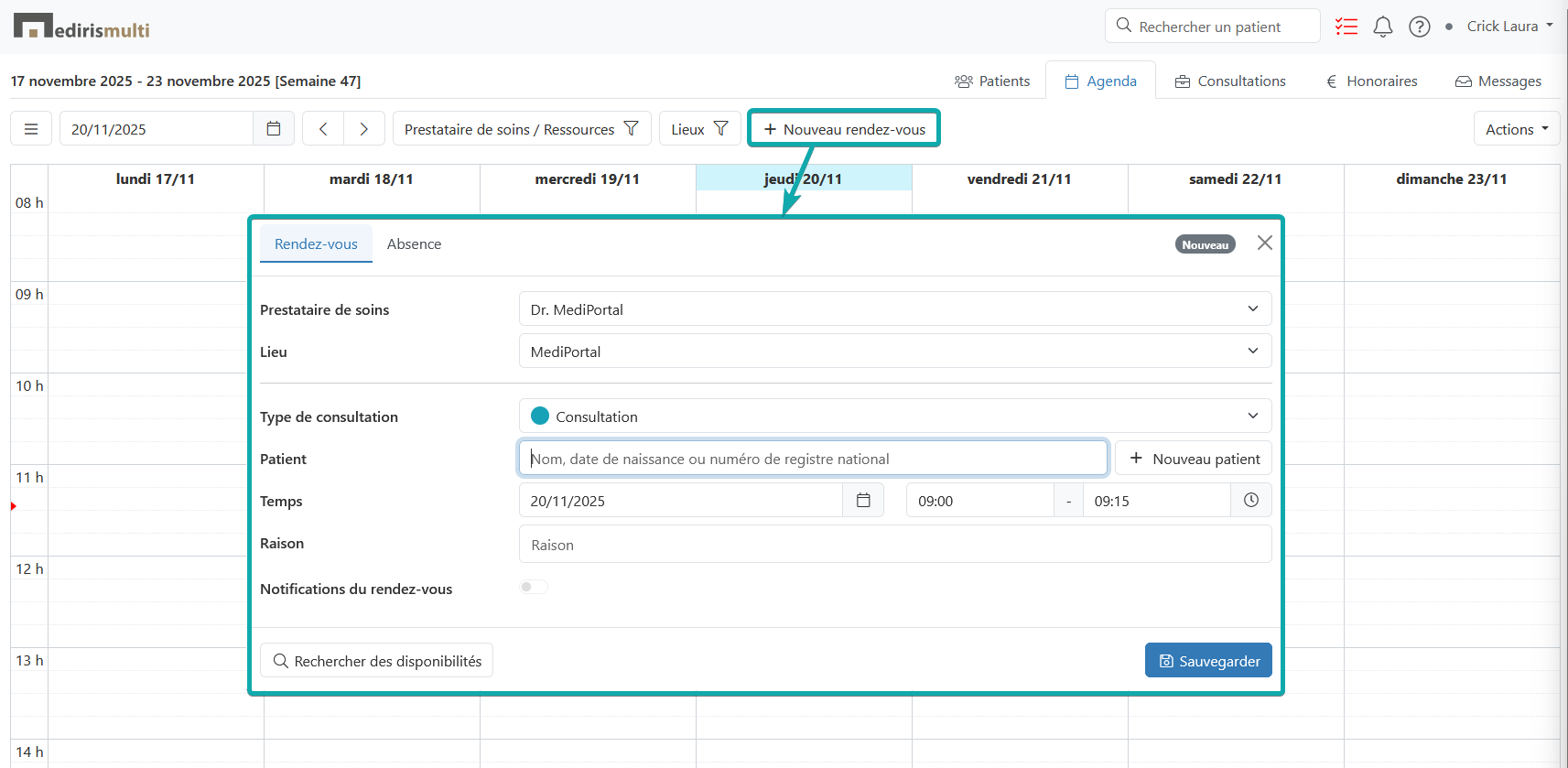 Dans l'onglet « Agenda » , vous pouvez enregistrer des rendez-vous. Sélectionnez le créneau horaire souhaité ou cliquez sur « Nouveau rendez-vous ». Recherchez le bon patient en saisissant le nom, la date de naissance ou le numéro de registre national ou créez immédiatement un nouveau patient. Si vous avez activé les notifications, vérifiez qu'une adresse e-mail et/ou un numéro de téléphone portable valides ont été saisis.