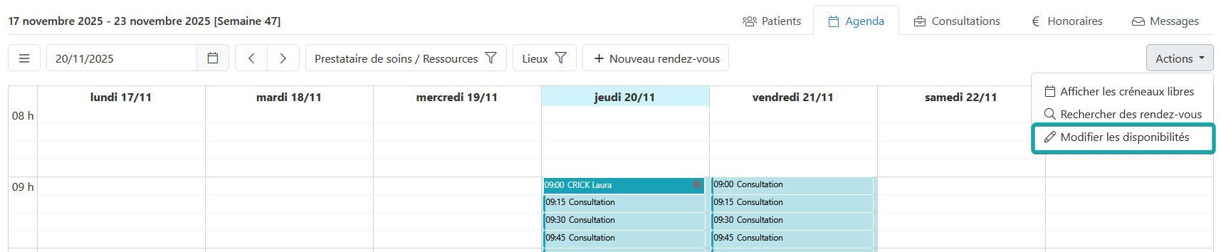 Le bouton « Actions » vous permet d'indiquer vos disponibilités. Ainsi, vous ou votre secrétariat saurez immédiatement quand vous pourrez voir des patients.