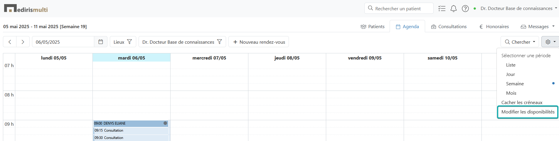 Ouvrez l'agenda et, via la roue dentée, choisissez de modifier les disponibilités. Grâce à ces horaires de travail, vous pouvez préciser quand vous êtes disponible pour tel ou tel type de consultation.