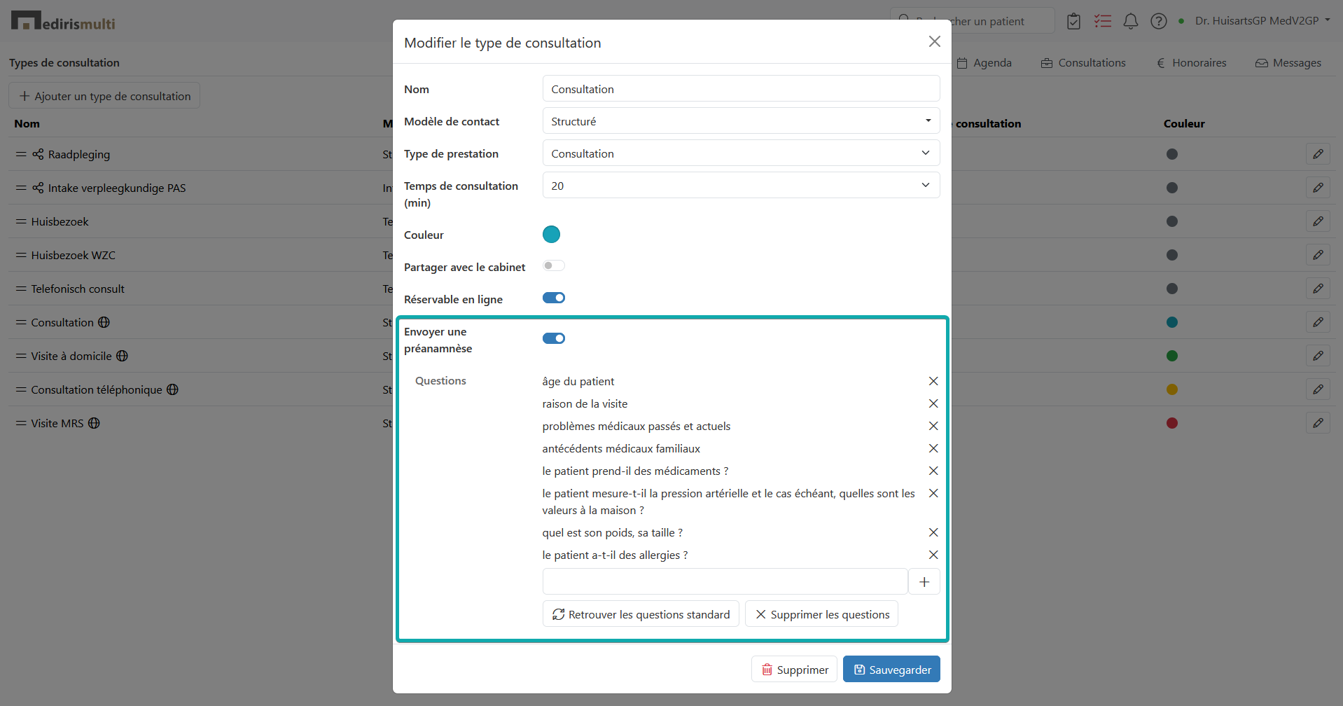 Une fois que nous avons activé cette fonctionnalité, vous pouvez, dans les paramètres des types de consultation, créer vous-même les questions ou choisir parmi les questions standard. Pour chaque type de consultation, vous choisissez s'il faut envoyer une pré-anamnèse et, le cas échéant, quelles questions y inclure.