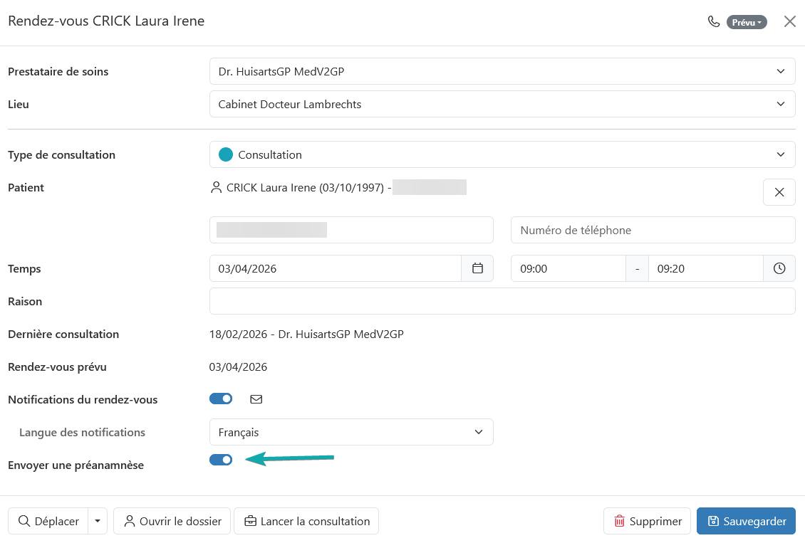Lors de la prise de rendez-vous, il est important de disposer d'une adresse e-mail pour le patient. Ce n'est qu'ainsi qu'il sera possible d'envoyer le questionnaire préalable.