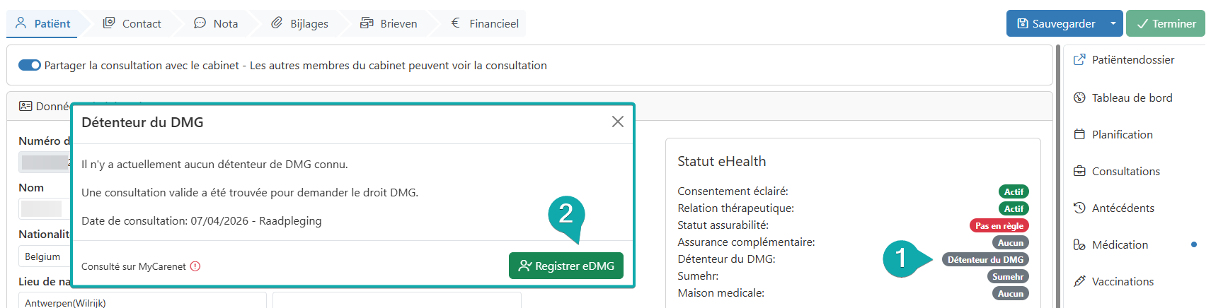 Une demande d'eDMG ne peut être introduite que si une consultation valide avec une nomenclature correcte (par exemple 101076) a été enregistrée au cours des 7 derniers jours. Cette condition est-elle remplie ? Dans ce cas, vous pouvez cliquer sur l'étiquette eDMG dans le dossier ou dans la consultation pour enregistrer la demande.