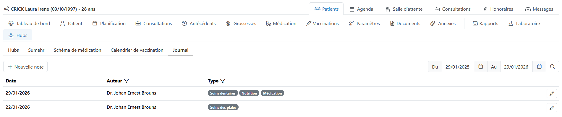 Le journal est destiné à l'échange de communications non urgentes entre vous et d'autres prestataires de soins. Il comprend notamment des observations, des rendez-vous et des informations complémentaires pertinentes pour le suivi du patient, mais qui n'ont pas leur place dans le Sumehr.