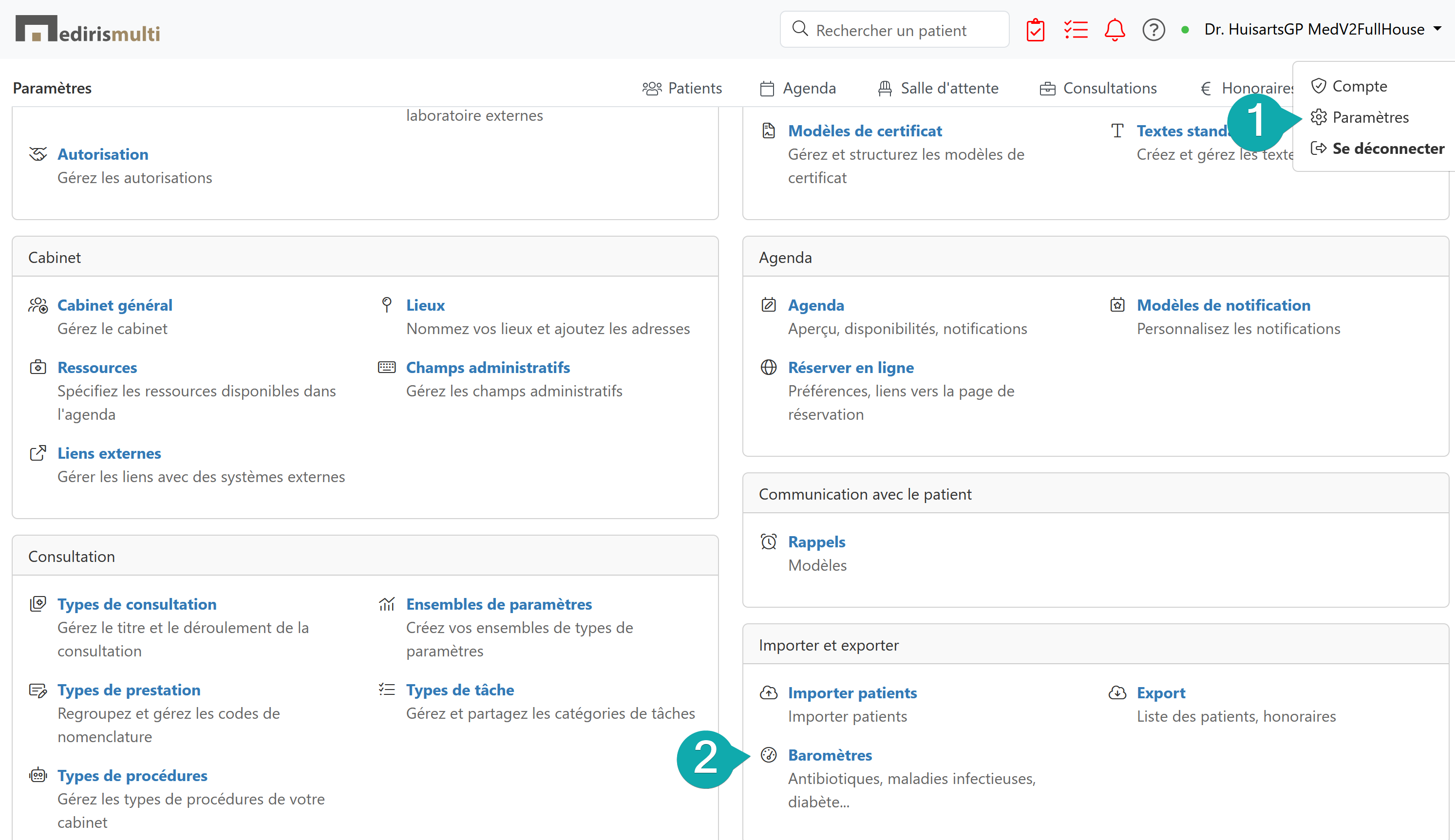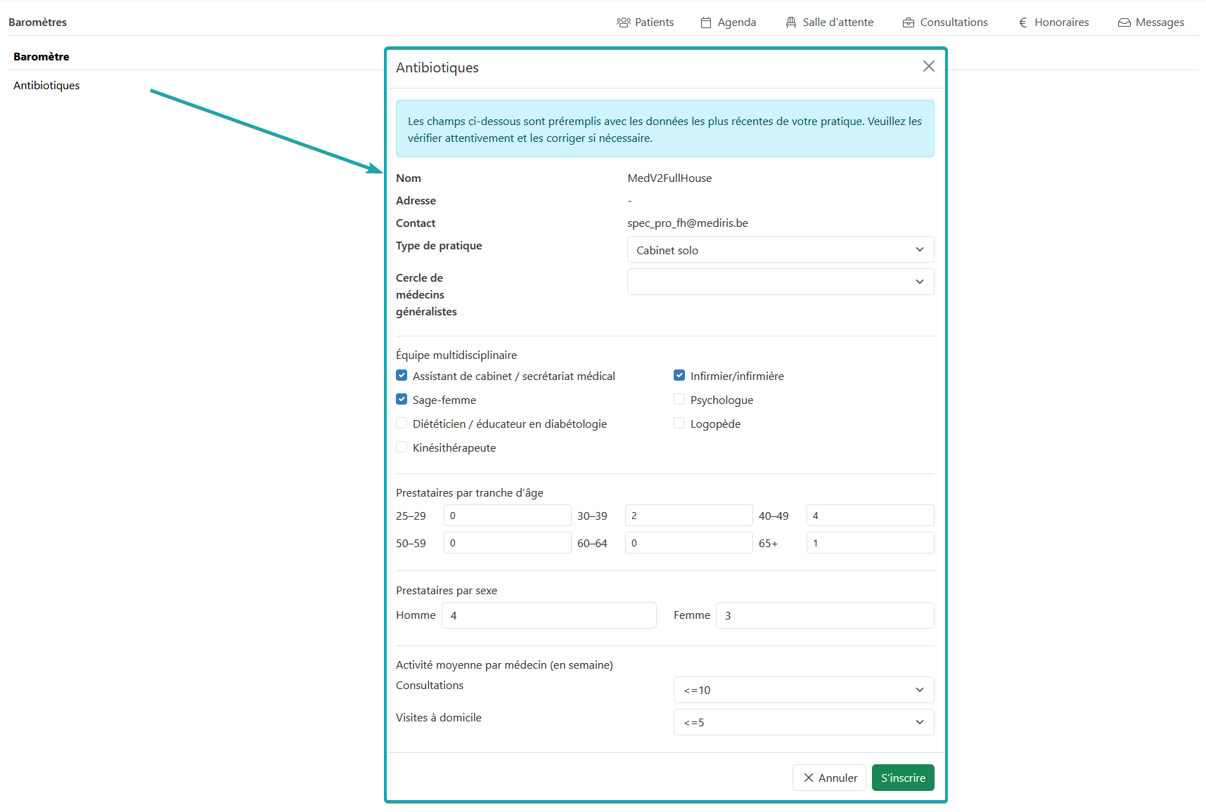Pour utiliser les baromètres, vous devez vous inscrire dans les paramètres de Mediris sous la rubrique « Baromètres ». La participation est également importante dans le cadre de la prime de pratique : pour y avoir droit, vous devez être inscrit à au moins deux des trois baromètres suivants : diabète, antibiotiques et IRC.