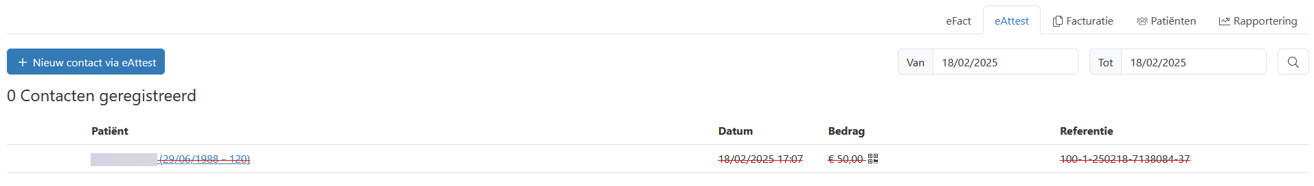 Het eAttest werd definitief geannuleerd als het in rood doorstreept is. Als de betaling nog niet werd uitgevoerd door de mutualiteit, zullen ze dit ook niet meer doen. Werd de patiënt wel al terugbetaald, dan zal de mutualiteit dit bedrag terugvorderen of afhouden van een volgende uitbetaling aan de patiënt.