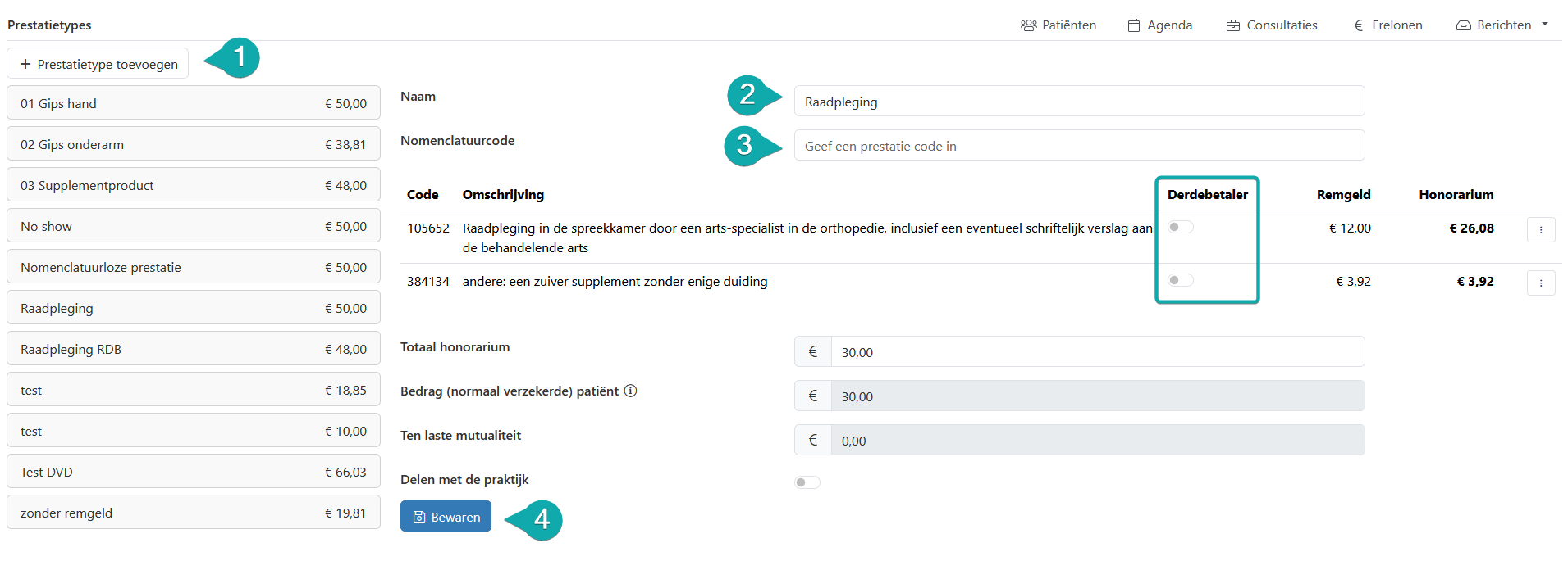 Kies een naam en vul de gewenste prestatiecode(s) in. Vergeet niet aan te duiden of de facturatie volgens de derdebetalersregeling moet verlopen of niet.
