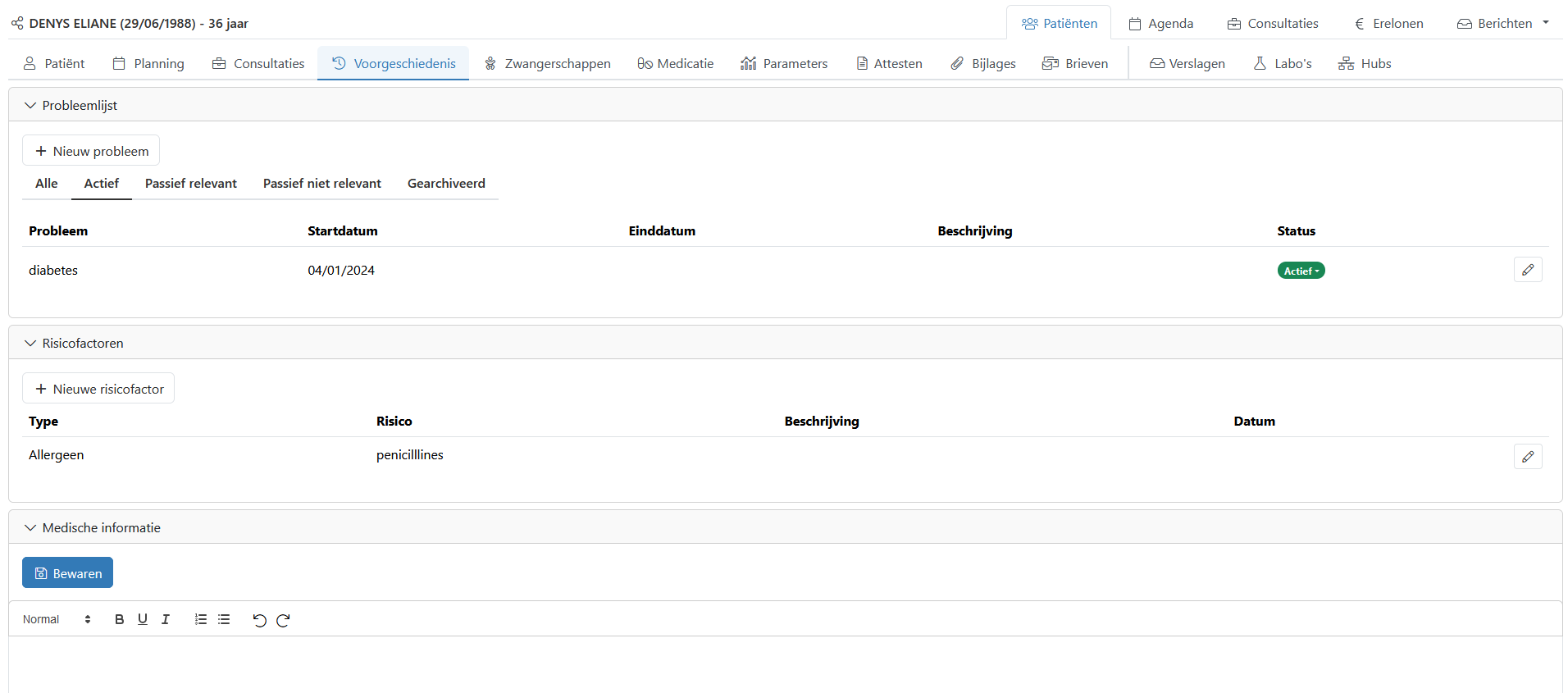 Zowel in het patiëntendossier als tijdens een consultatie kan u de voorgeschiedenis van de patiënt bijhouden. U kan problemen, risicofactoren en algemene antecedenten toevoegen.