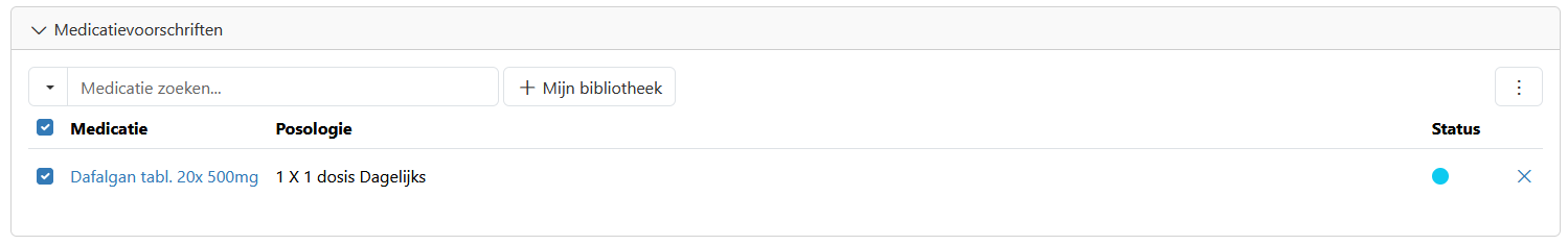 Alle actieve geneesmiddelen worden opgenomen in het medicatieschema. Dit schema vindt u terug in het patiëntendossier en kan u via de drie puntjes afdrukken of per mail doorsturen.