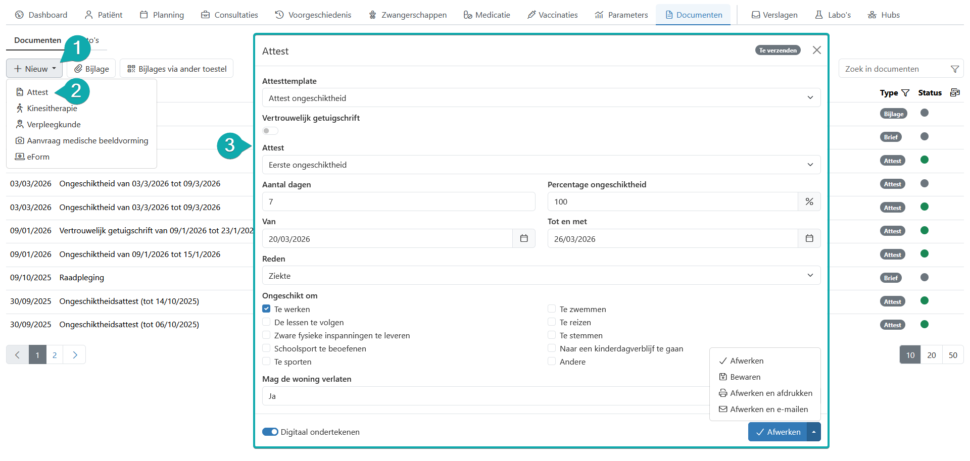U kan een attest opmaken in de consultatie via het actieplan of via de tab "Documenten" in het patiëntendossier. U kan ze dan ook digitaal ondertekenen en een logo toevoegen aan het document.