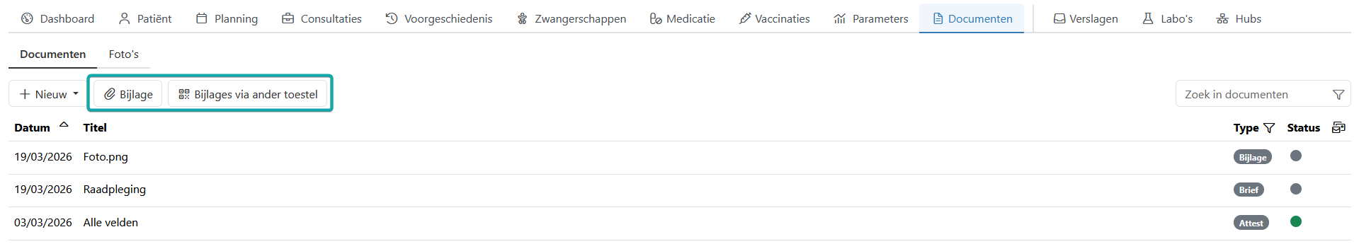 U kan foto's en andere documenten opladen als bijlage (maximumgrootte 50MB). Dat kan op twee plaatsen: in het dossier onder het tabblad "Documenten" of tijdens de consultatie in de stap "Bijlages". Er zijn twee mogelijkheden om bestanden op te laden: