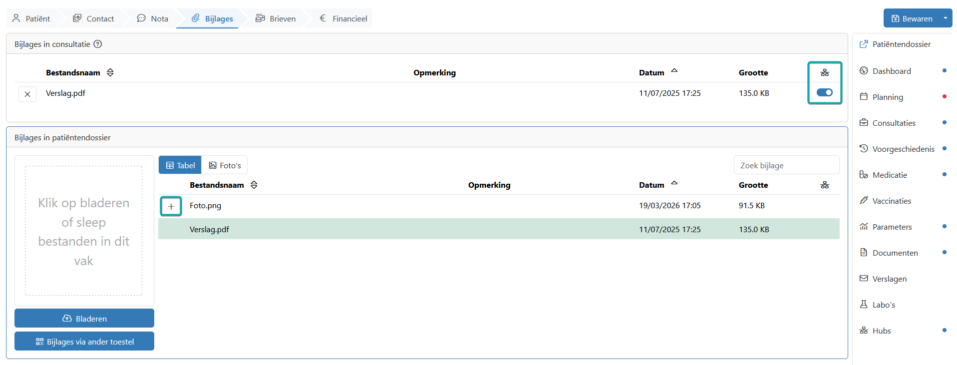 Tijdens een consultatie kan u het bestand samen met uw brief versturen naar een collega-zorgverlener. Klik hiervoor op het plusteken in de stap "Bijlages".