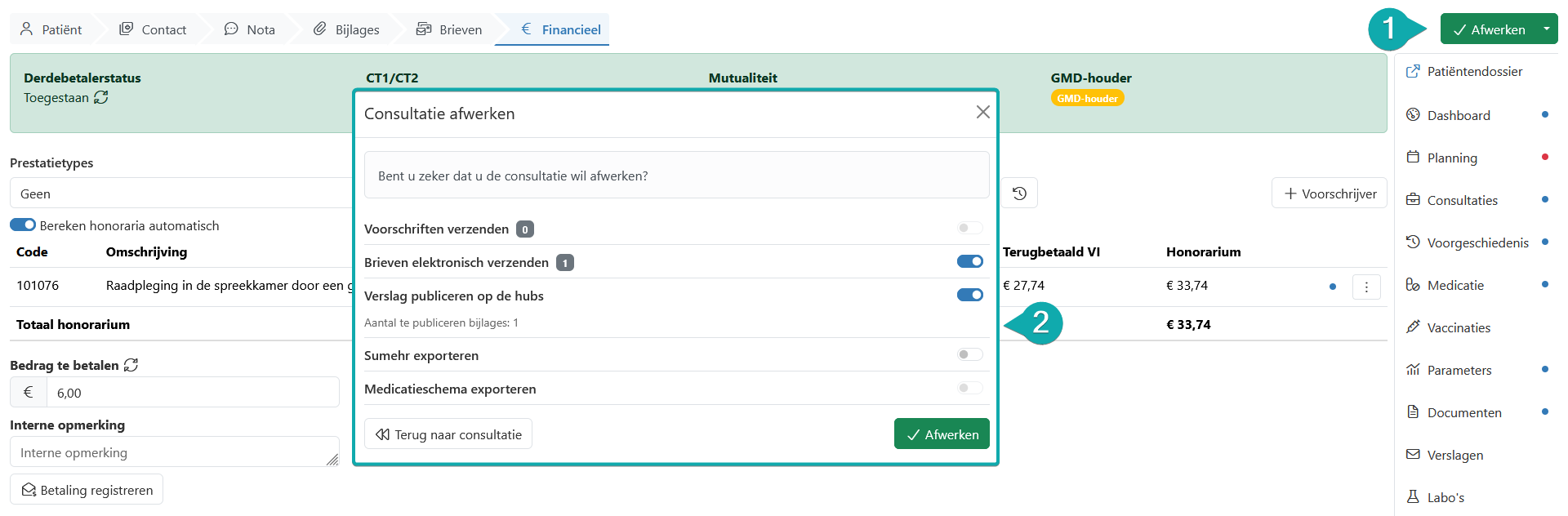 In de laatste stap "Financieel" kan u de brief effectief gaan verzenden en publiceren door op "Afwerken" te klikken. Dat kan ook in eender welke stap via het pijltje naast de knop "Bewaren".