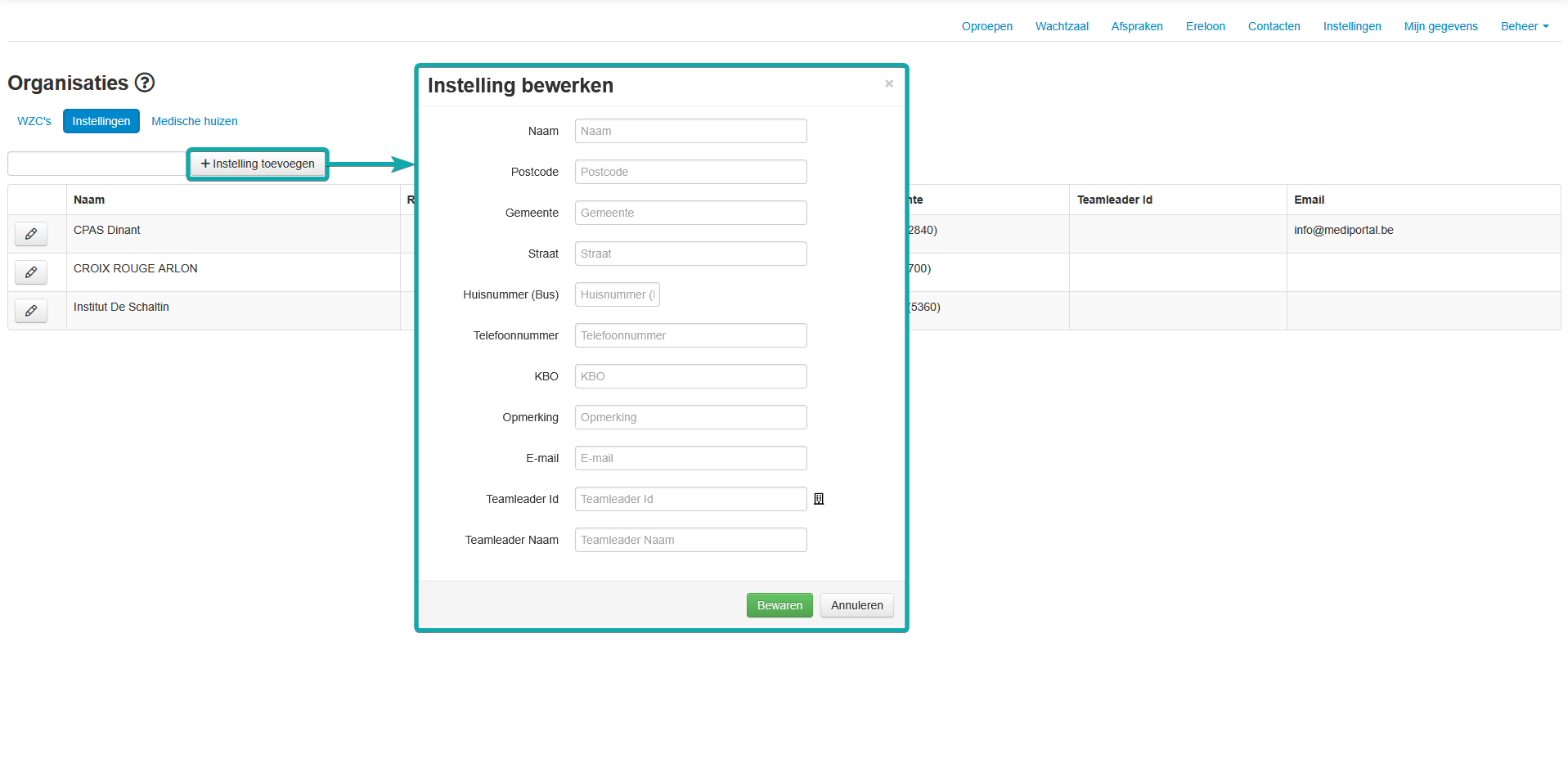 In het tabblad "Beheer" > "Organisaties" kan u de WZC's, instellingen en medische huizen toevoegen waar de wachtpost aan factureert.