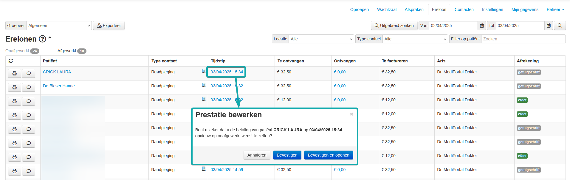 Wenst u andere elementen te wijzigen, bv. de nomenclatuurcodes? Klik dan op het tijdstip van het contact en bevestig dat u het ereloon wilt heropenen.