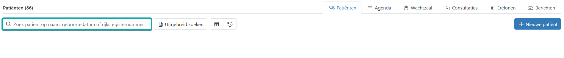 U kan een patiënt via de zoekbalk opzoeken door de naam, de geboortedatum of het rijksregisternummer in te geven: