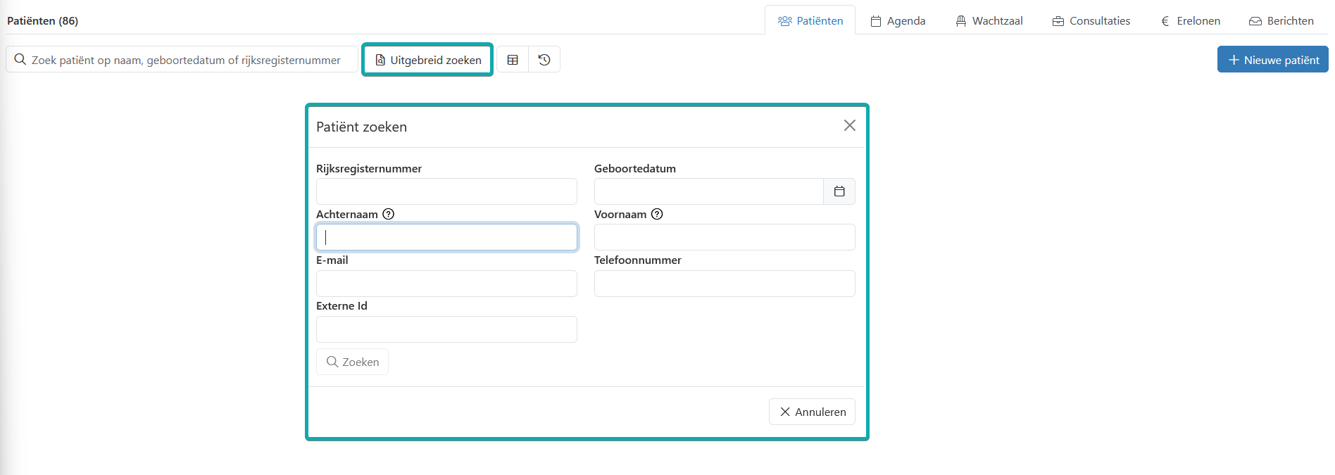 Via de knop "Uitgebreid zoeken" kan u zoeken op achternaam, voornaam, geboortedatum en rijksregisternummer.