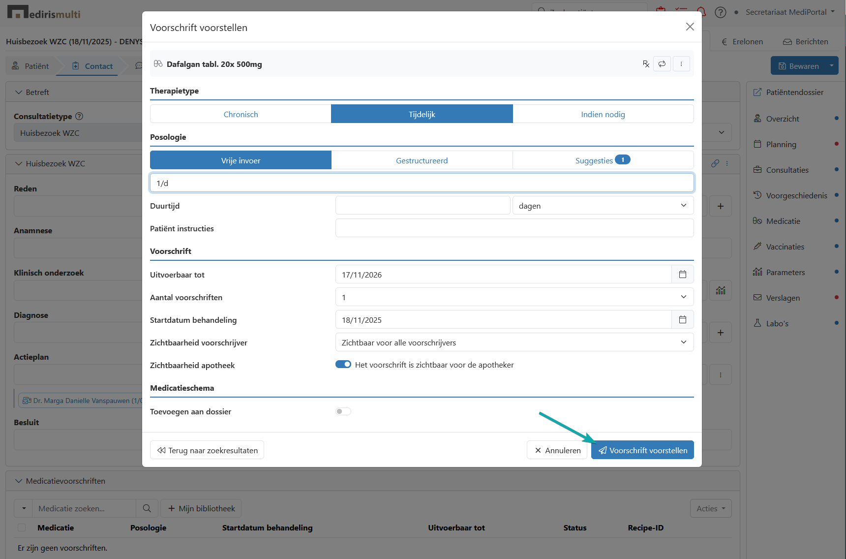 • Het secretariaat kan tijdens een consultatie voorschriften klaarzetten. Zorg ervoor dat een arts geselecteerd is als auteur van de consultatie en zoek vervolgens de juiste medicatie op.