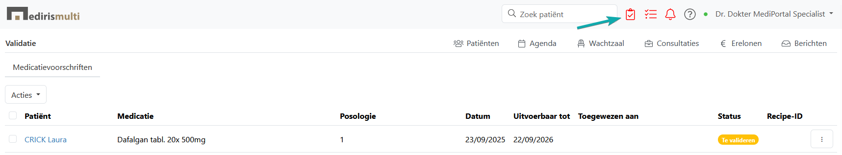 De arts vindt de voorschriften vervolgens bovenaan in zijn/haar account terug via het klembord. Daar kunnen ze gevalideerd worden.