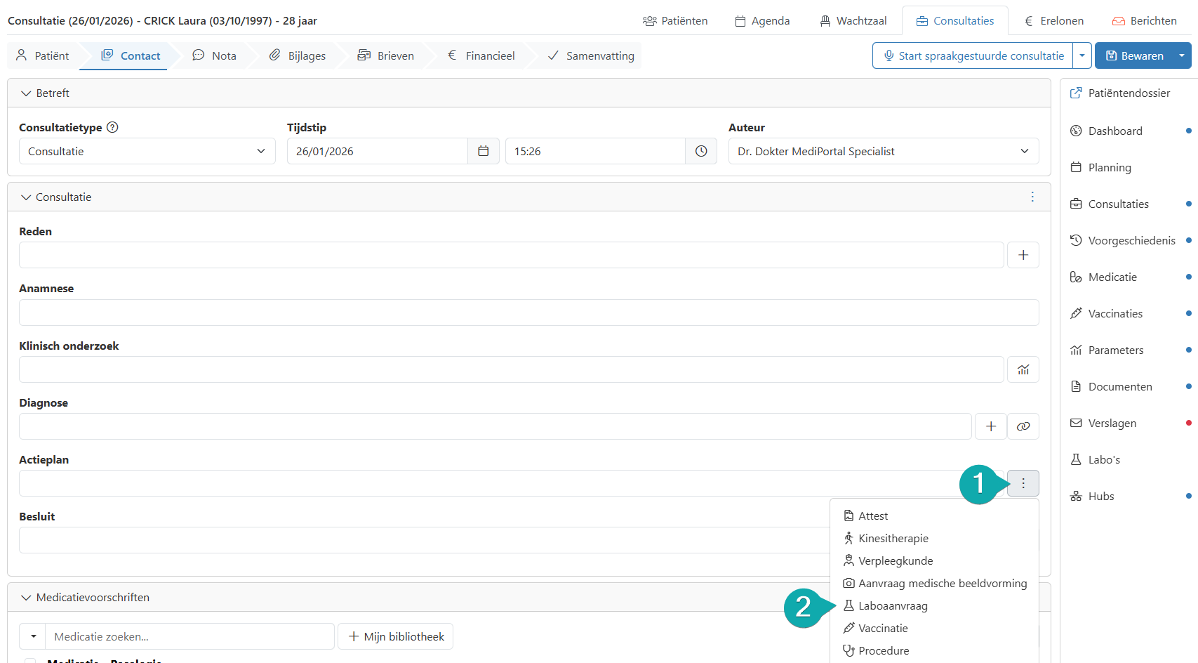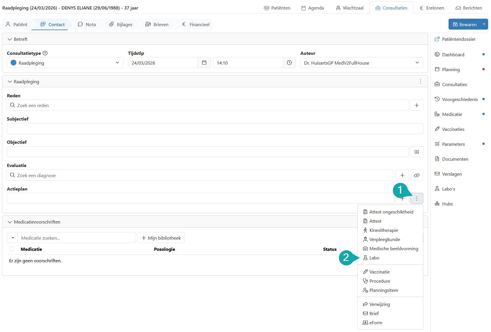 Tijdens een consultatie kan u een nieuwe labo-aanvraag indienen in de stap "Contact" bij het actieplan.