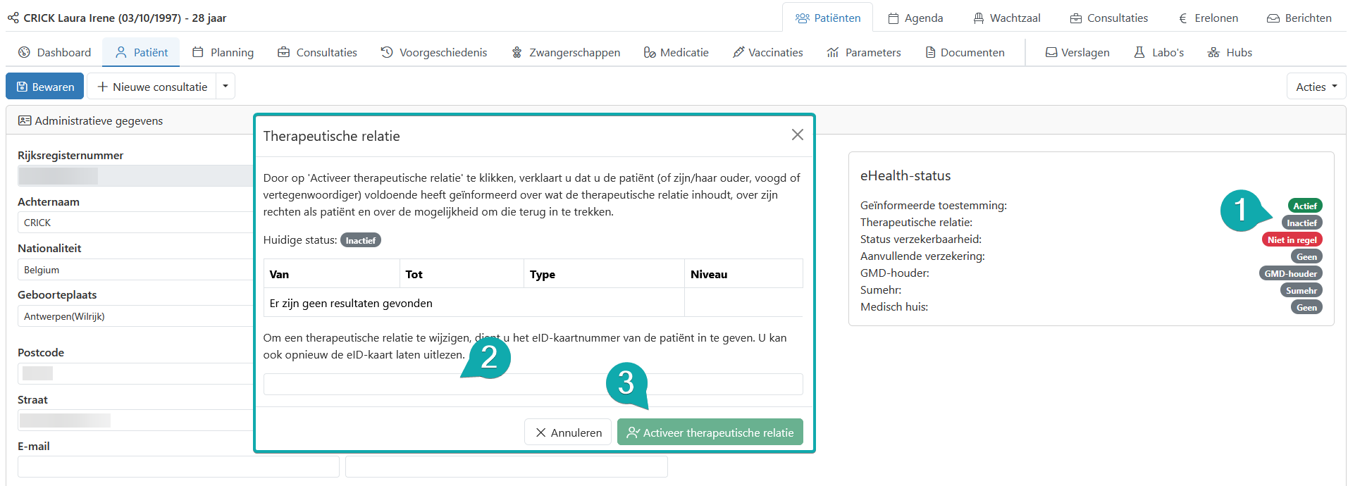 - U moet een therapeutische relatie hebben met de patiënt. U kan deze aanmaken door de eID van de patiënt uit te lezen, of door in het tabblad "Patiënt" op "Inactief" te klikken bij de therapeutische relatie. In de pop-up geeft u het kaartnummer van de patiënt in.