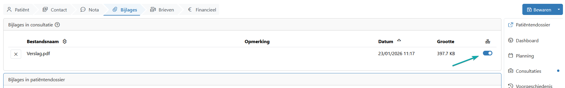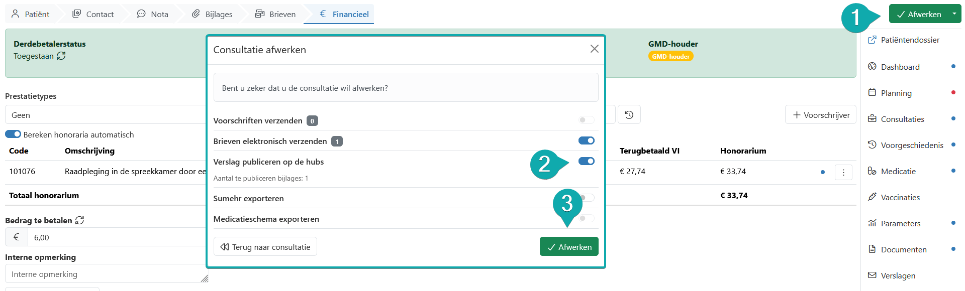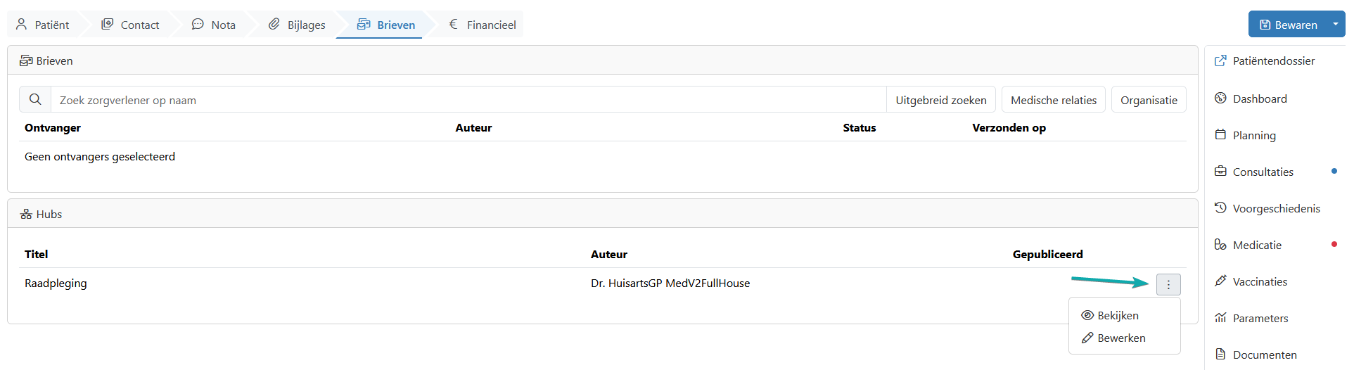 Hebt u een Pro- of Premium-licentie? Dan kan u zelf ook uw verslagen publiceren op de hubs. Dat doet u vanuit een consultatie. Wat u in de stap "Contact" noteert, wordt als basis gebruikt. In de stap "Brieven" kan u de inhoud van uw verslag nog aanpassen.