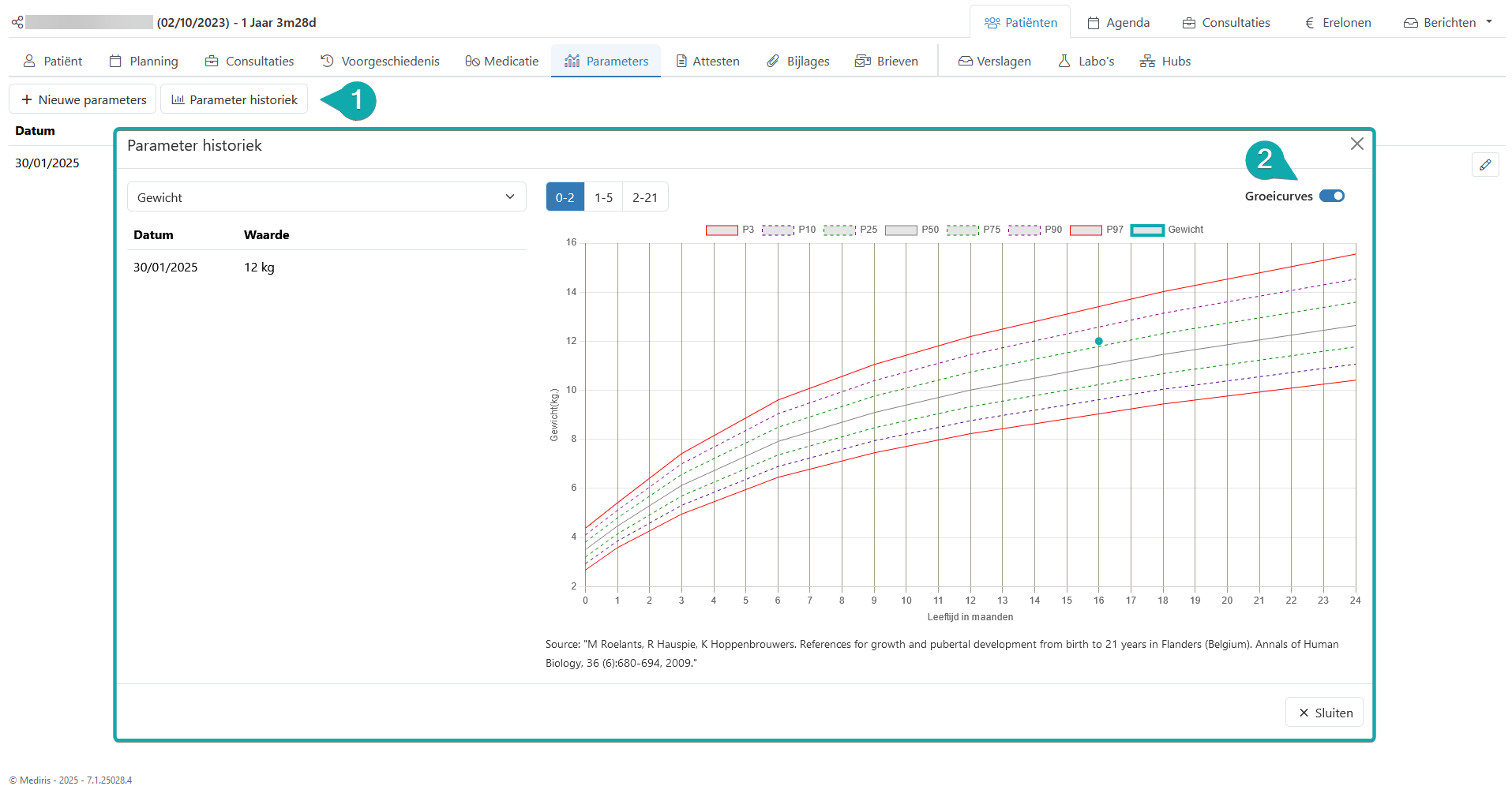 U kan de groeicurves terugvinden in het patiëntendossier in het tabblad "Parameters". Als u minstens één keer de parameters hebt geregistreerd voor de patiënt vindt u daar de knop "Parameters historiek" terug. Vervolgens kan u in de pop-up aanduiden dat u de groeicurves wilt bekijken.