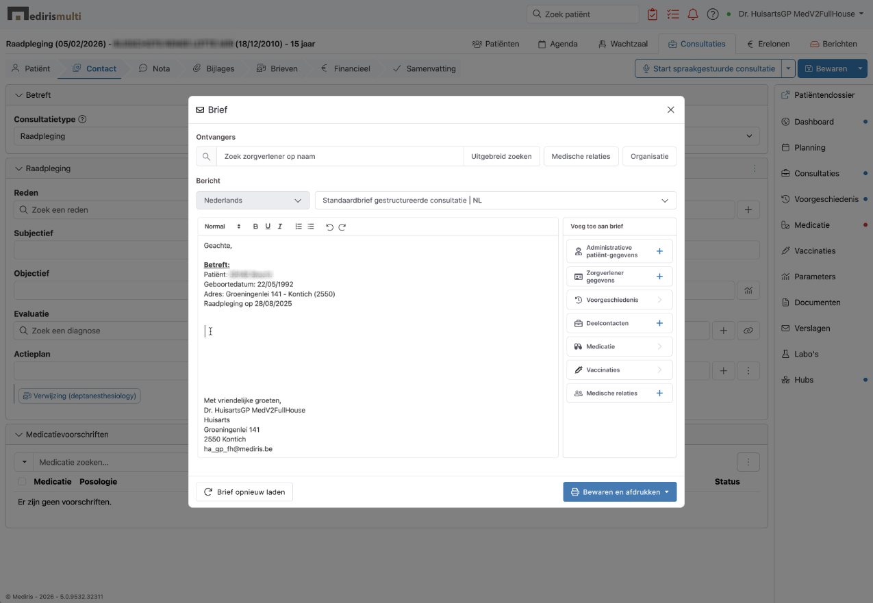 Het opstellen van een brief wordt een stuk vlotter. Tijdens het opstellen kan u, ongeacht de gekozen template, zelf bepalen welke onderdelen u extra wilt toevoegen, zoals de actieve medicatie of de voorgeschiedenis. Zo stemt u elke brief eenvoudig af op de situatie.